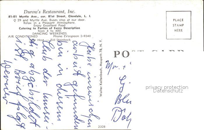 72161950 Glendale Long Island Durow’s Restaurant postalisch nicht gelaufen Erhaltung siehe scans KatCode: 14140340000000