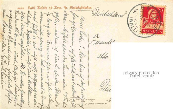 74132714 Gletscher Ferner Glacier Glaciar Ghiacciaio– Hotel Belalp Brig Aletschgletscher postalisch gelaufen Erhaltung siehe scans [SanaeD93] alte Postkarte Sana Katcode 22440000000600