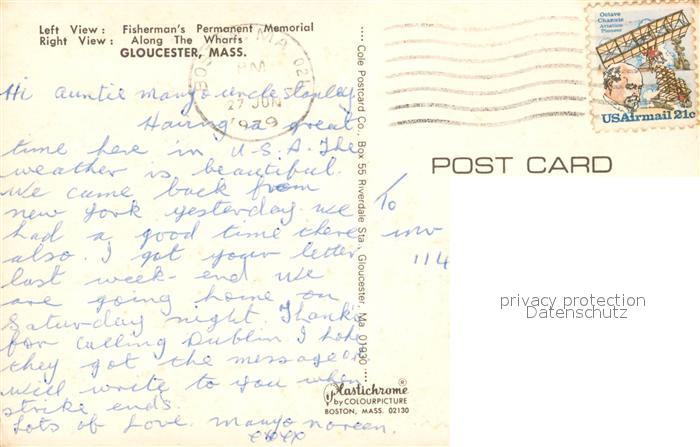 73131793 old postcard Gloucester Massachusetts Fisherman’s Permanent Memorial Wharf Fishing boat postalisch gelaufen Erhaltung siehe scans [FriedD77] KatCode: 14140230000000