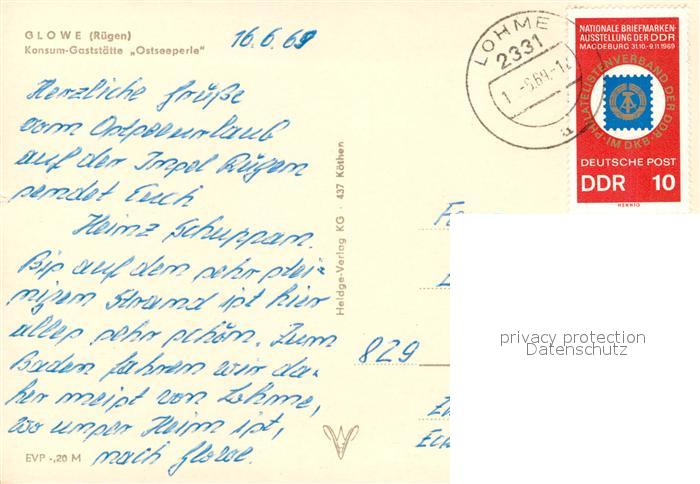 73675885 alte Postkarte Glowe Ruegen Konsum Gaststaette Ostseeperle postalisch gelaufen Erhaltung siehe scans [FriedD77] KatCode: 11110013061013