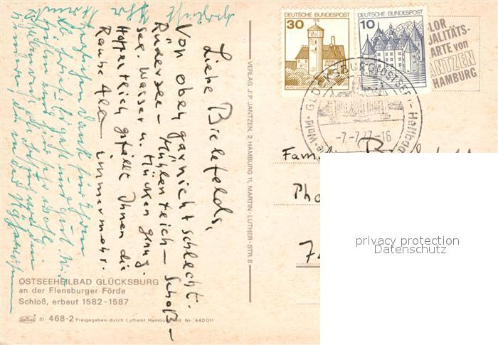73110303 alte Postkarte Gluecksburg Ostseebad Fliegeraufnahme Schloss postalisch gelaufen Erhaltung siehe scans [NatalD47] KatCode: 11110001059113