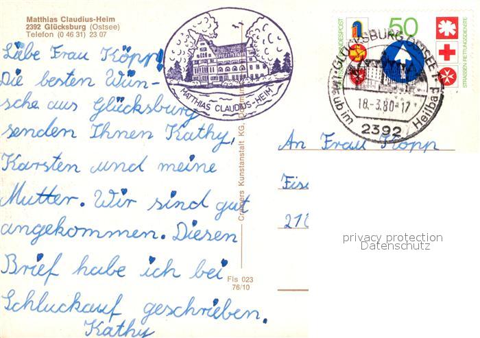 72959868 alte Postkarte Gluecksburg Ostseebad Matthias Claudius Heim postalisch gelaufen Erhaltung siehe scans [WerneD78] KatCode: 11110001059113