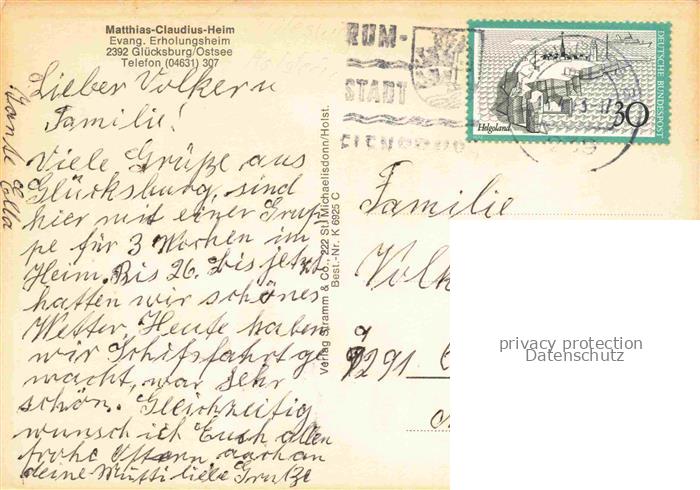 74037636 alte Postkarte Gluecksburg Ostseebad Matthias-Claudius-Heim Evangelisches Erholungsheim postalisch gelaufen Erhaltung siehe scans [FriedD77] KatCode: 11110001059113