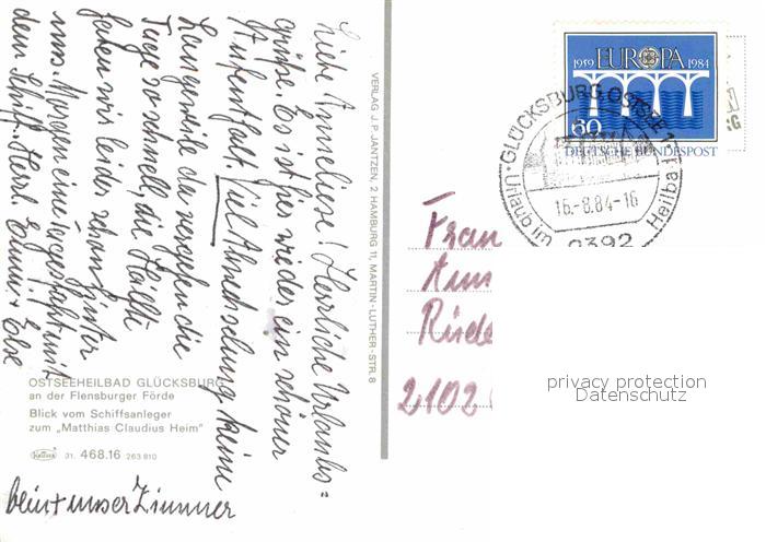 72713002 alte Postkarte Gluecksburg Ostseebad Schiffsanleger und Matthias Claudius Heim postalisch gelaufen Erhaltung siehe scans [LiesaD40] KatCode: 11110001059113
