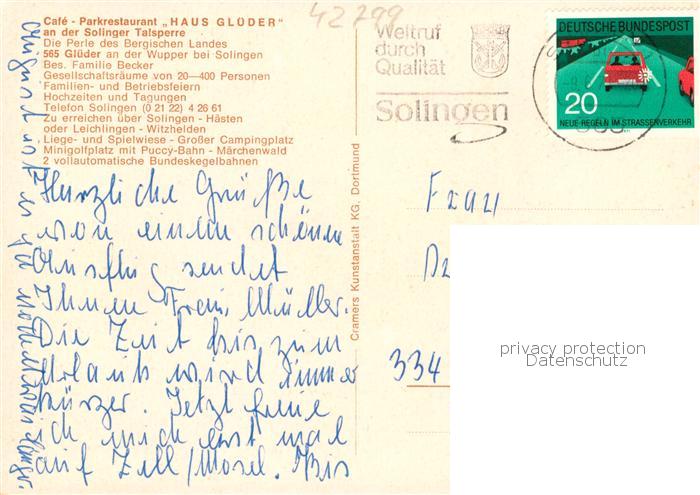 73863505 alte Postkarte Glueder Solingen Cafe Parkrestaurant Haus Glueder Schaenke Minigolfplatz Kegelbahn Hochzeitssaal postalisch gelaufen Erhaltung siehe scans [WerneD78] KatCode: 11110005122000