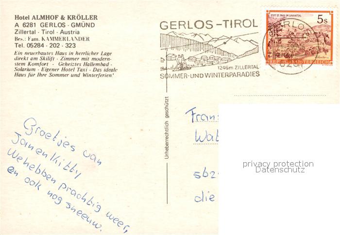 73028892 alte Postkarte Gmuend Gerlos Hotel Almhof Gasthof Kroeller postalisch gelaufen Erhaltung siehe scans [PaolaD17] KatCode: 11390335070912