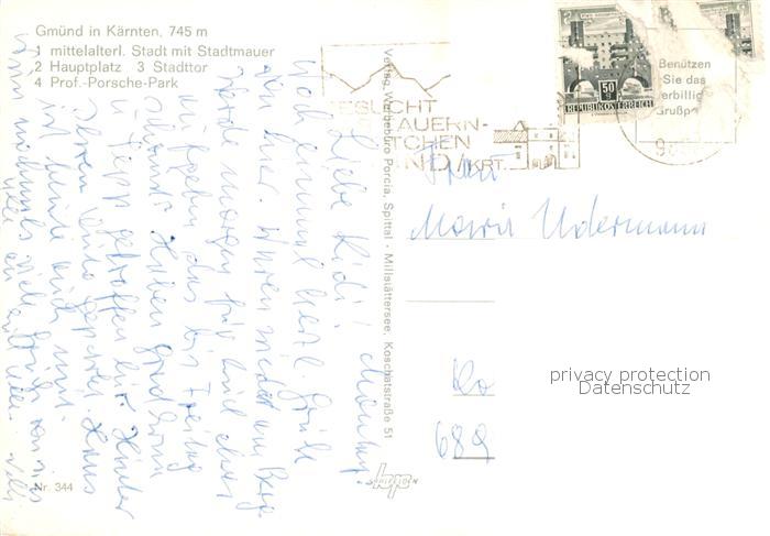 73856047 alte Postkarte Gmuend Kaernten Panorama Hauptplatz Stadttor Prof.-Porsche-Park postalisch gelaufen Erhaltung siehe scans [FriedD77] KatCode: 11390212020608