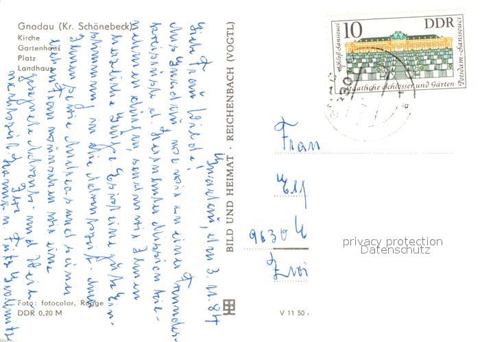 73550011 alte Postkarte Gnadau Kirche Gartenhaus Platz Landhaus postalisch gelaufen Erhaltung siehe scans [WerneD78] KatCode: 11110015089140