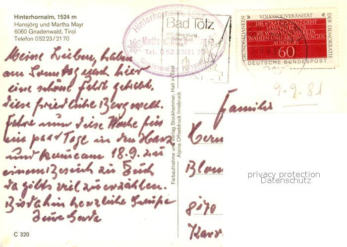 73152526 alte Postkarte Gnadenwald Hinterhornalm Alpen postalisch gelaufen Erhaltung siehe scans [FriedD77] KatCode: 11390332070311