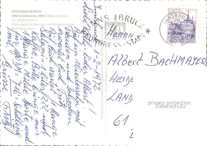 72071406 alte Postkarte Gnadenwald Speckbacherhof postalisch gelaufen Erhaltung siehe scans KatCode: 11390332070311