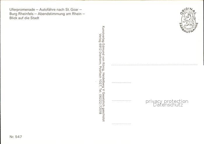 72519239 Goar St Uferpromenade Autofaehre Burg Rheinfels Abendstimmung postalisch nicht gelaufen Erhaltung siehe scans KatCode: 11110007140133