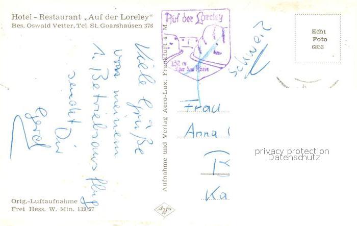 73162673 alte Postkarte Goarshausen St Fliegeraufnahme Hotel Restaurant Auf der Loreley postalisch gelaufen Erhaltung siehe scans [KathaD81] KatCode: 11110007141121