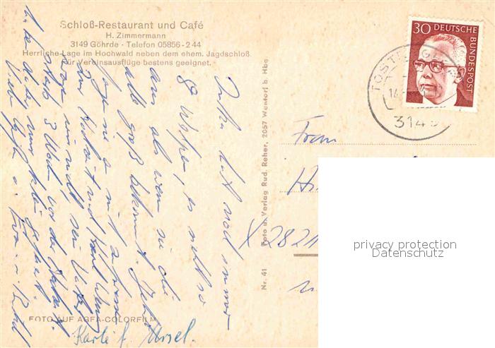 72624490 alte Postkarte Goehrde Schloss Restaurant postalisch gelaufen Erhaltung siehe scans [NatalD47] KatCode: 11110003354006