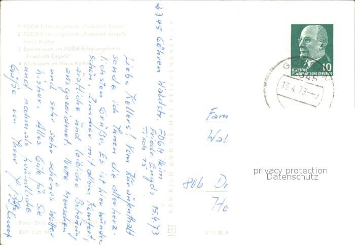 72363201 alte Postkarte Goehren Ruegen FDGB- Erholungsheim Friedrich Engels Haus Kaethe postalisch gelaufen Erhaltung siehe scans KatCode: 11110013061014