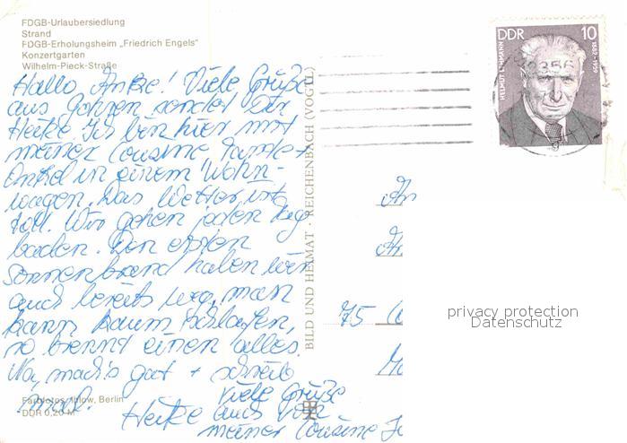 72767177 alte Postkarte Goehren Ruegen FDGB Erholungsheim Friedrich Engels Strand Wilh Pieck Str postalisch gelaufen Erhaltung siehe scans [WerneD78] KatCode: 11110013061014