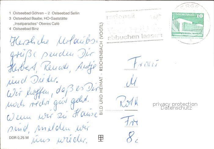 72407964 alte Postkarte Goehren Ruegen Konzertpavillon Sellin Strand Baabe HO Gaststaette Inselparadies Cafe Binz postalisch gelaufen Erhaltung siehe scans KatCode: 11110013061014