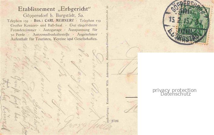 74010466 alte Postkarte Goeppersdorf Burgstaedt Sachsen Etablissement Erbgericht Saal Gastzimmer Speisezimmer postalisch gelaufen Erhaltung siehe scans [FriedD77] KatCode: 11110014182060