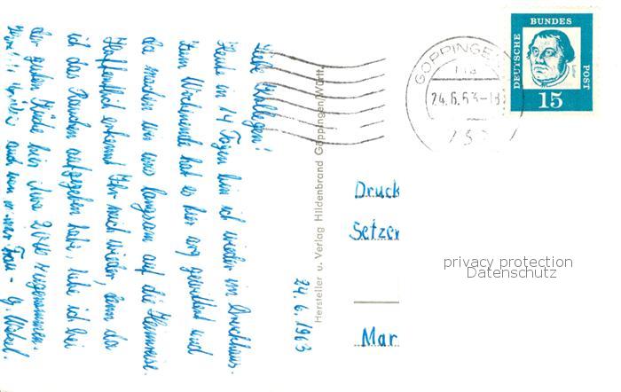 73833230 alte Postkarte Goeppingen Altersheim Der Storchen Klinik Dr Landerer Schlossportal Oberhofenkirche Moerikeschule Rathaus Stadthalle Freibad Panorama Gewerbliche Berufsschule postalisch gelaufen Erhaltung siehe scans [WerneD78] KatCode: 11110008117026