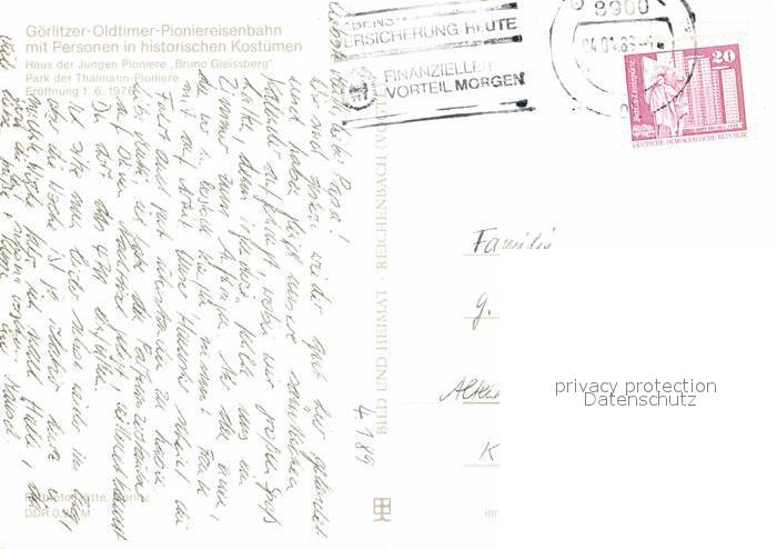 72796554 alte Postkarte Goerlitz Sachsen Oldtimer Pioniereisenbahn Personen in historischen Kostuemen postalisch gelaufen Erhaltung siehe scans [FriedD77] KatCode: 11110014263000