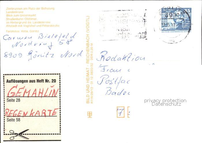 72461676 alte Postkarte Goerlitz Sachsen Zierbrunnen Platz der Befreiung Landeskrone Untermarkt postalisch gelaufen Erhaltung siehe scans KatCode: 11110014263000