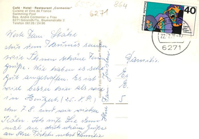 73890680 alte Postkarte Goersroth Huenstetten Taunus Restaurant Cafe Hotel Andre Cormenier Gastraeume Freibad Panorama postalisch gelaufen Erhaltung siehe scans [WerneD78] KatCode: 11110006439007