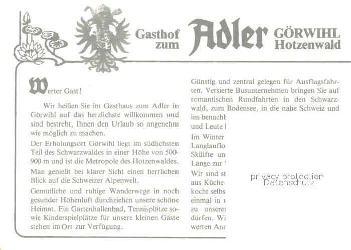 73616393 Goerwihl Gasthof zum Adler postalisch nicht gelaufen Werbekarte (keine Postkarte) Erhaltung siehe scans [WerneD78] KatCode: 11110008337038