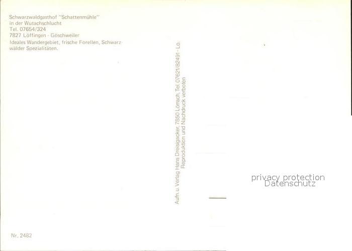 71894125 Goeschweiler Schwarzwaldgasthof Schattenmuehle Wutachschlucht postalisch nicht gelaufen KatCode: 11110008315070