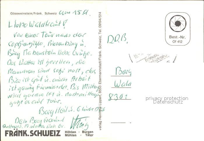 72297394 alte Postkarte Goessweinstein Altstadt Burg Goessweinsteiner Lied postalisch gelaufen Erhaltung siehe scans KatCode: 11110009474129