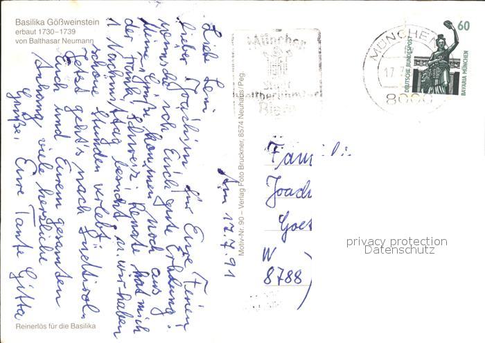 72263155 alte Postkarte Goessweinstein Basilika 18. Jhdt. Erbauer Balthasar Neumann postalisch gelaufen Erhaltung siehe scans KatCode: 11110009474129