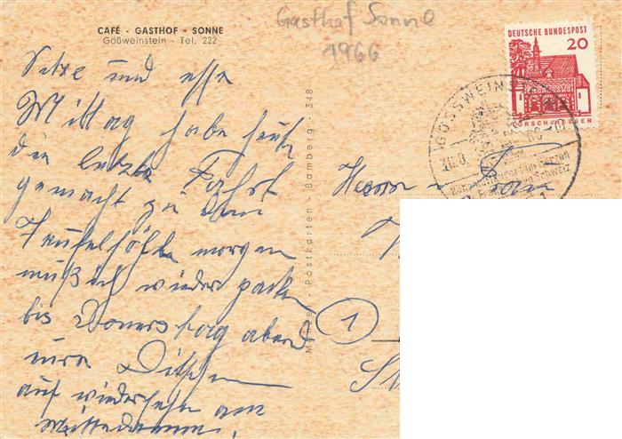 73975769 alte Postkarte Goessweinstein Café Gasthof Sonne postalisch gelaufen Erhaltung siehe scans [FriedD77] KatCode: 11110009474129
