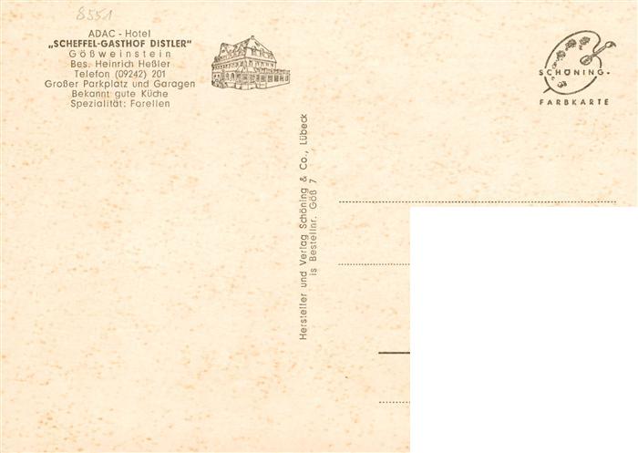 73924170 Goessweinstein Fliegeraufnahme Burg Wiesenttal Scheffel Gasthof Distler Wallfahrtskirche Wagner Hoehe Hauptstrasse postalisch nicht gelaufen Erhaltung siehe scans [FriedD77] KatCode: 11110009474129