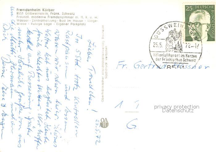 73717202 alte Postkarte Goessweinstein Fremdenheim Koerber Terrasse Park Gaststube postalisch gelaufen Erhaltung siehe scans [WerneD78] KatCode: 11110009474129