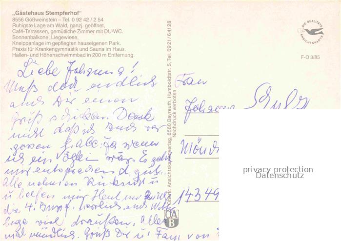 74039531 Goessweinstein Gaestehaus Stempferhof Garten postalisch nicht gelaufen Erhaltung siehe scans [FriedD77] KatCode: 11110009474129