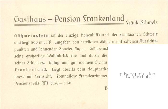 73791978 Goessweinstein Gasthaus-Pension Frankenland Informationen postalisch nicht gelaufen Werbekarte (keine Postkarte) Erhaltung siehe scans [LiesaD40] KatCode: 11110009474129