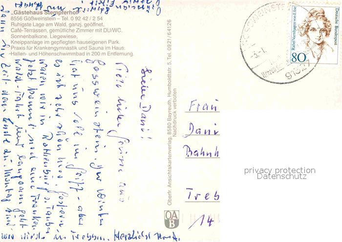 72840062 alte Postkarte Goessweinstein Gasthaus Stempferhof postalisch gelaufen Erhaltung siehe scans [LiesaD40] KatCode: 11110009474129