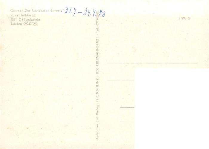 73878791 Goessweinstein Gasthof Zur Fraenkischen Schweiz postalisch nicht gelaufen Erhaltung siehe scans [WerneD78] KatCode: 11110009474129