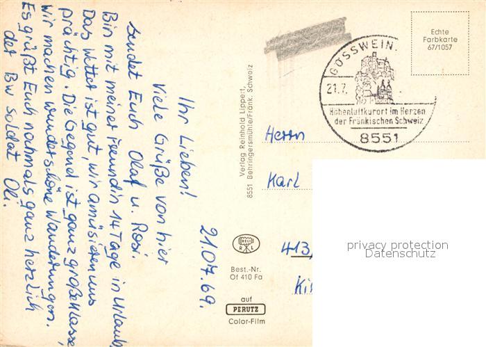 72940060 alte Postkarte Goessweinstein Kirche Burg Wallfahrtskirche Wallfahrtsort Fraenkische Schweiz postalisch gelaufen Erhaltung siehe scans [FriedD77] KatCode: 11110009474129