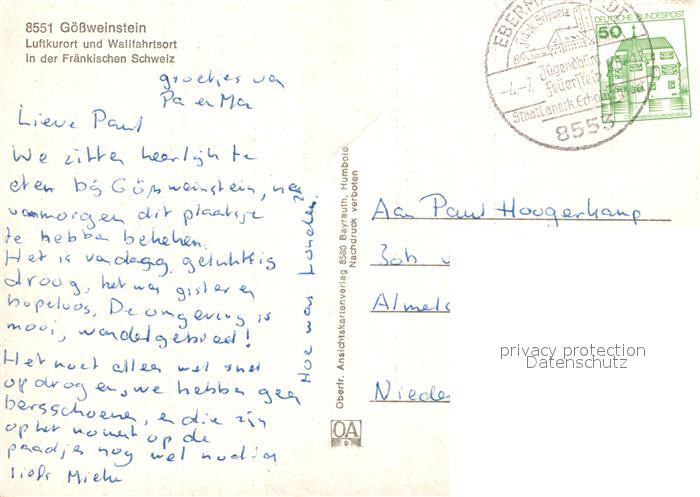 72930997 alte Postkarte Goessweinstein Panorama Schloss Teilansicht Kirche postalisch gelaufen Erhaltung siehe scans [WerneD78] KatCode: 11110009474129