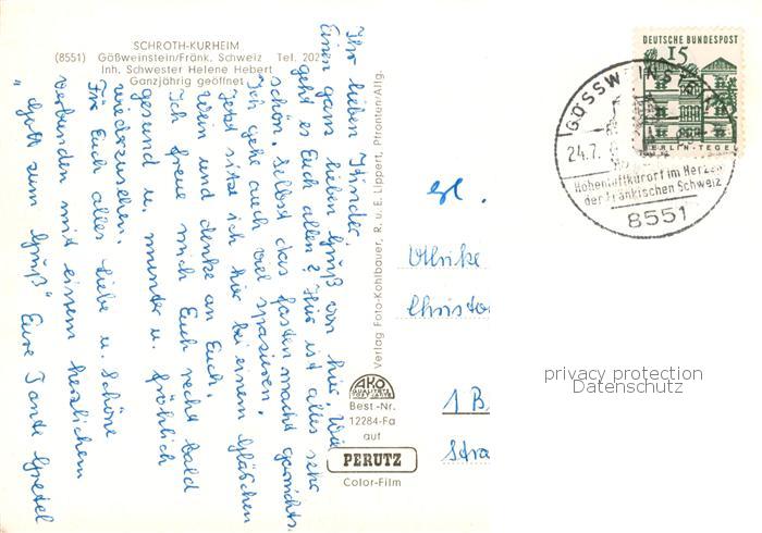 73787331 alte Postkarte Goessweinstein Schroth Kurheim Fraenkische Schweiz postalisch gelaufen Erhaltung siehe scans [FriedD77] KatCode: 11110009474129