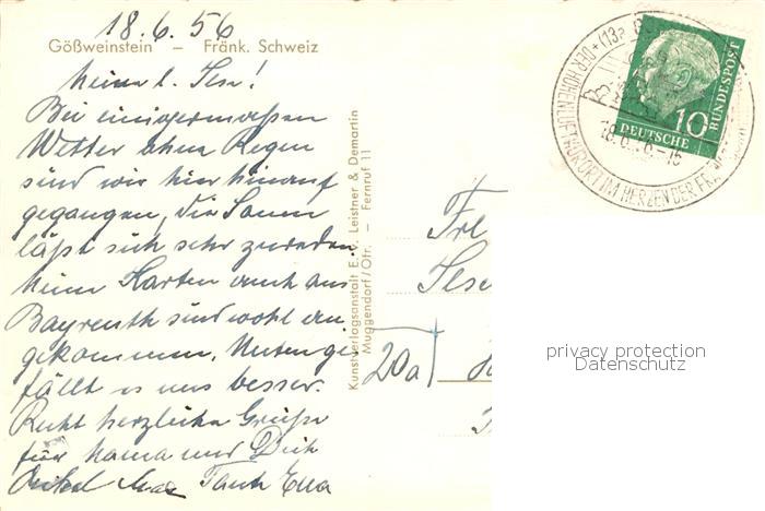 73811857 alte Postkarte Goessweinstein Stadt und Schloss postalisch gelaufen Erhaltung siehe scans [WerneD78] KatCode: 11110009474129
