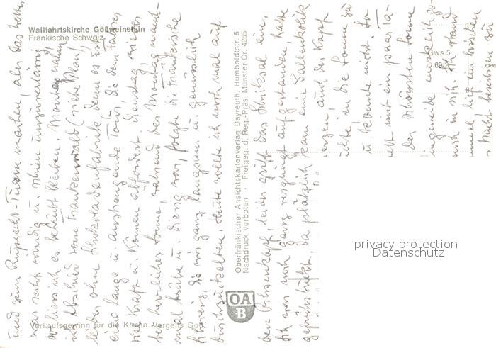 73686357 Goessweinstein Wallfahrtskirche Fraenkische Schweiz postalisch nicht gelaufen Erhaltung siehe scans [FriedD77] KatCode: 11110009474129