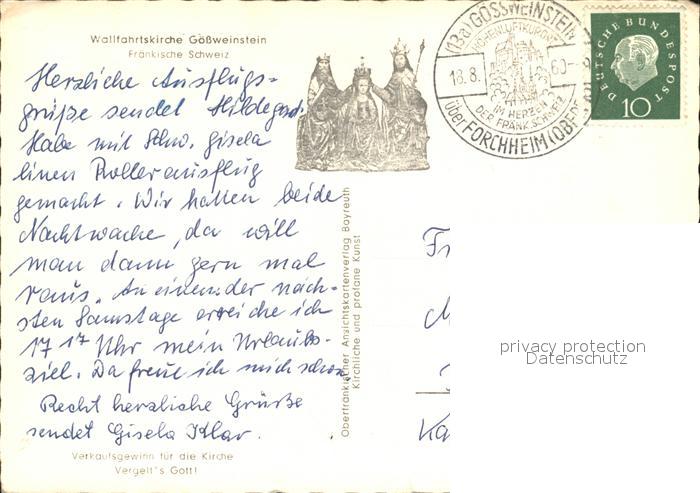 72412935 alte Postkarte Goessweinstein Wallfahrtskirche Fraenkische Schwez postalisch gelaufen Erhaltung siehe scans KatCode: 11110009474129