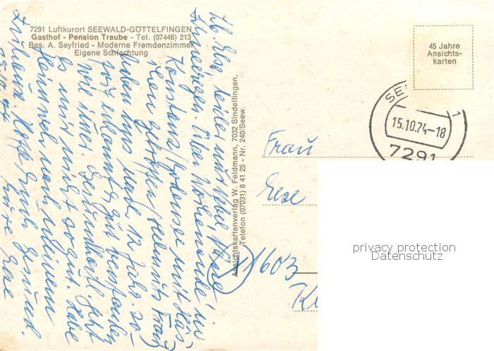 73776052 alte Postkarte Goettelfingen Seewald Schwarzwald Gasthof Pension Traube Gastraum Terrasse Seepartie postalisch gelaufen Erhaltung siehe scans [WerneD78] KatCode: 11110008237073