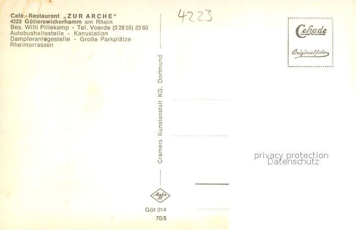 73692350 Goetterswickerhamm Niederrhein Cafe Restaurant Zur Arche am Rhein Bootsanleger Fahrgastschiff Promenade postalisch nicht gelaufen Erhaltung siehe scans [FriedD77] KatCode: 11110005170044