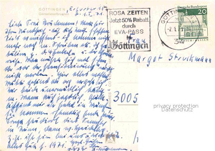 72705398 alte Postkarte Goettingen Niedersachsen Gaenselieselbrunnen postalisch gelaufen Erhaltung siehe scans [WerneD78] KatCode: 11110003152012