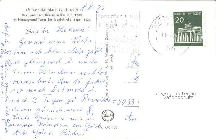 72186603 alte Postkarte Goettingen Niedersachsen Gaenselieselbrunnen postalisch gelaufen Erhaltung siehe scans KatCode: 11110003152012