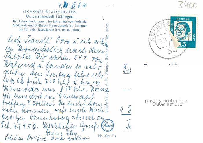 72915408 alte Postkarte Goettingen Niedersachsen Gaenselieselbrunnen Turm der Jacobikirche postalisch gelaufen Erhaltung siehe scans [WerneD78] KatCode: 11110003152012