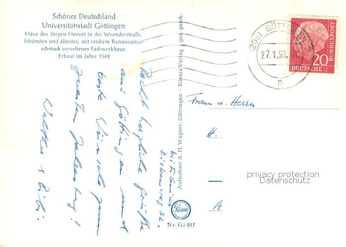 73755404 alte Postkarte Goettingen Niedersachsen Haus des Juergen Hoevet in der Weenderstrasse postalisch gelaufen Erhaltung siehe scans [FriedD77] KatCode: 11110003152012