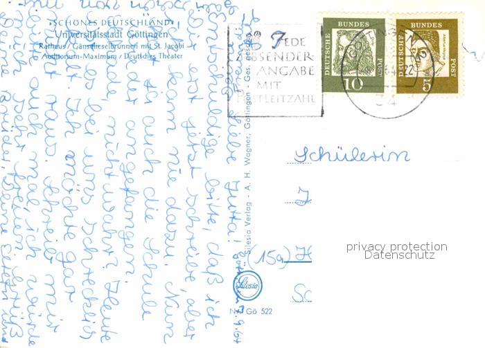 72831667 alte Postkarte Goettingen Niedersachsen Marktplatz Rathaus Gaenselieselbrunnen Sankt Jacobi Theater postalisch gelaufen Erhaltung siehe scans [KathaD81] KatCode: 11110003152012