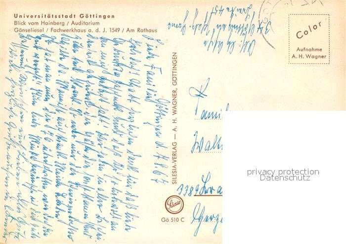 73128604 alte Postkarte Goettingen Niedersachsen Panorama Universitaetsstadt Blick vom Hainberg Auditorium Gaenselieselbrunnen Fachwerkhaus 16. Jhdt. Rathaus postalisch gelaufen Erhaltung siehe scans [FriedD77] KatCode: 11110003152012